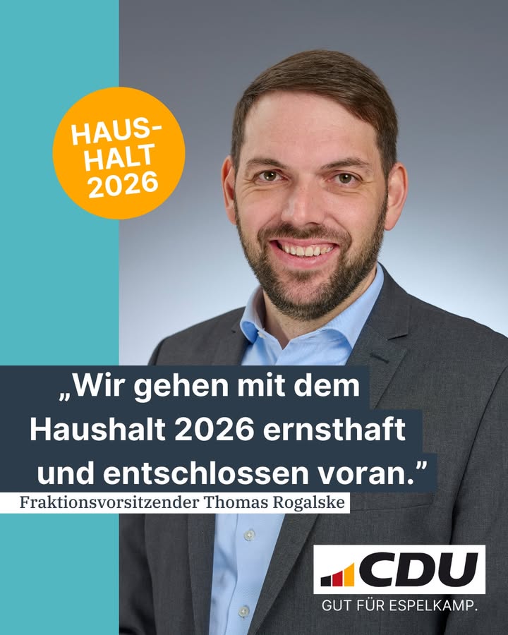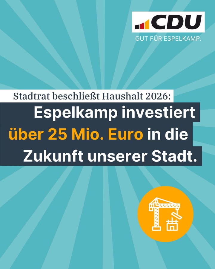 Wir investieren in Espelkamps Zukunft. 💪 Trotz herausfordernder Haushaltslage setzen wir bewusst Schwerpunkte.?"Ein Haushalt ist immer eine politische Schwerpunktsetzung", brachte es unser Fraktionsvorsitzender Thomas Rogalske in seiner Rede auf den Punkt. Unsere Schwerpunkte sind eindeutig:🏗️ Stadtentwicklung & Infrastruktur: Adient-Gelände, neues Rathaus, Entwicklung rund um das Krankenhaus, moderne öffentliche Gebäude ? wir gestalten die Stadt von morgen.👨👩👧👦 Kinder & Bildung: Neue Sporthallen, eine OGS-Mensa, starke Unterstützung für unsere Kitas.?Denn: "Kinder haben für die CDU immer Priorität."⚽ Sport & Ehrenamt: Von der neuen Stadtsporthalle bis zur Unterstützung unserer Dorfgemeinschaften ? wir stärken den Zusammenhalt in unserer Stadt und unseren Ortschaften.Wir investieren heute, damit Espelkamp morgen stark, modern und lebendig ist. Verantwortung übernehmen heißt auch: Zukunft gestalten.